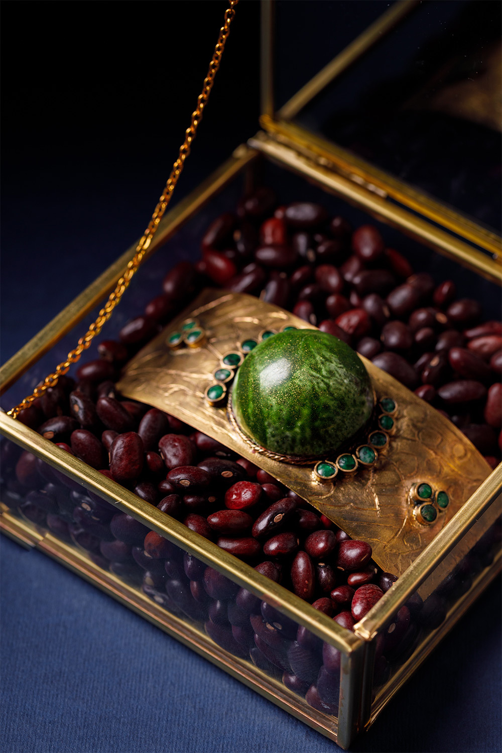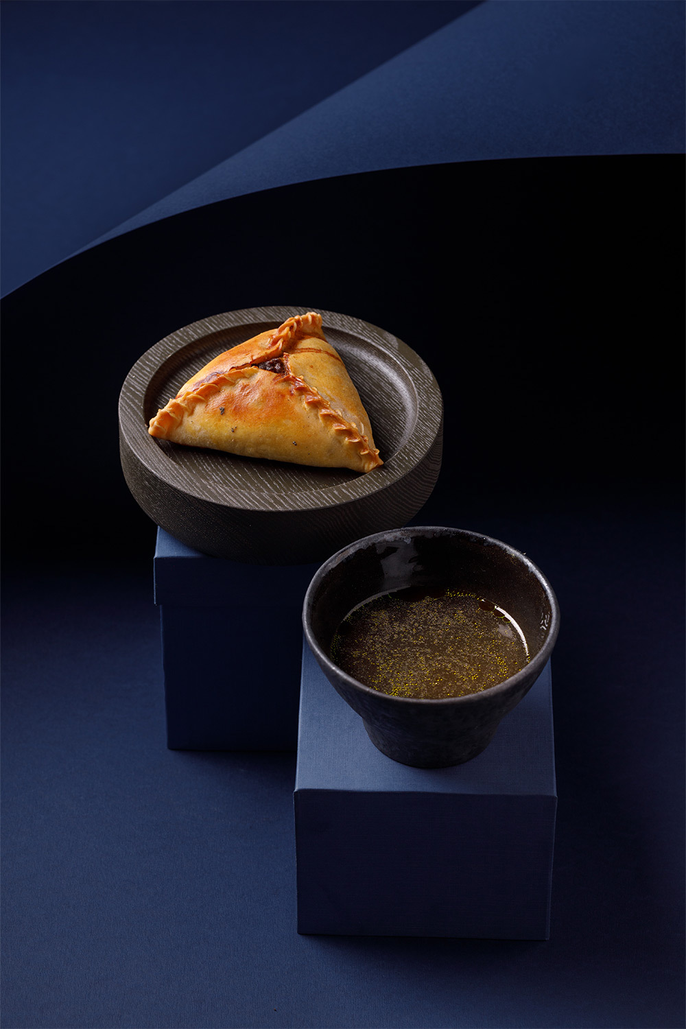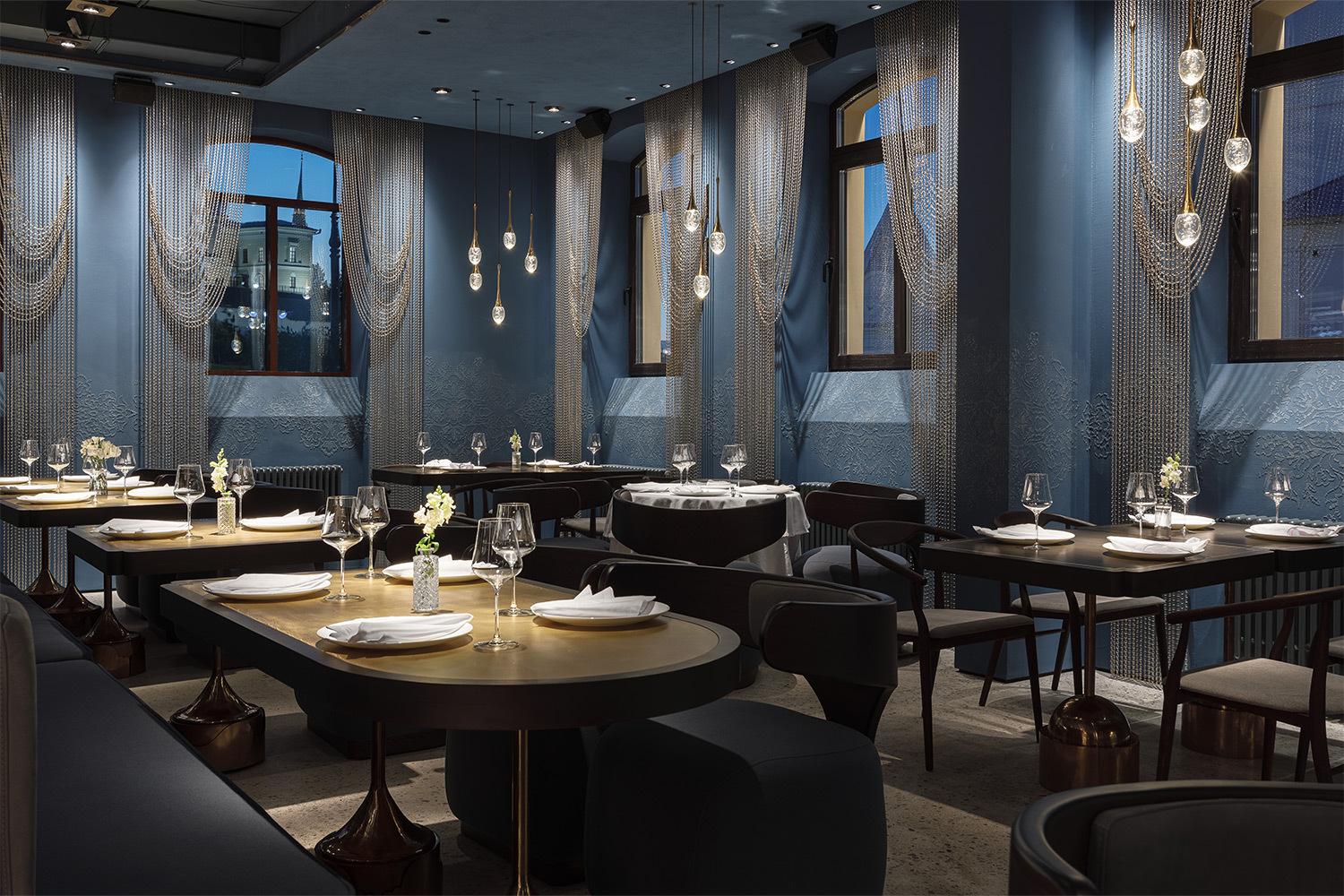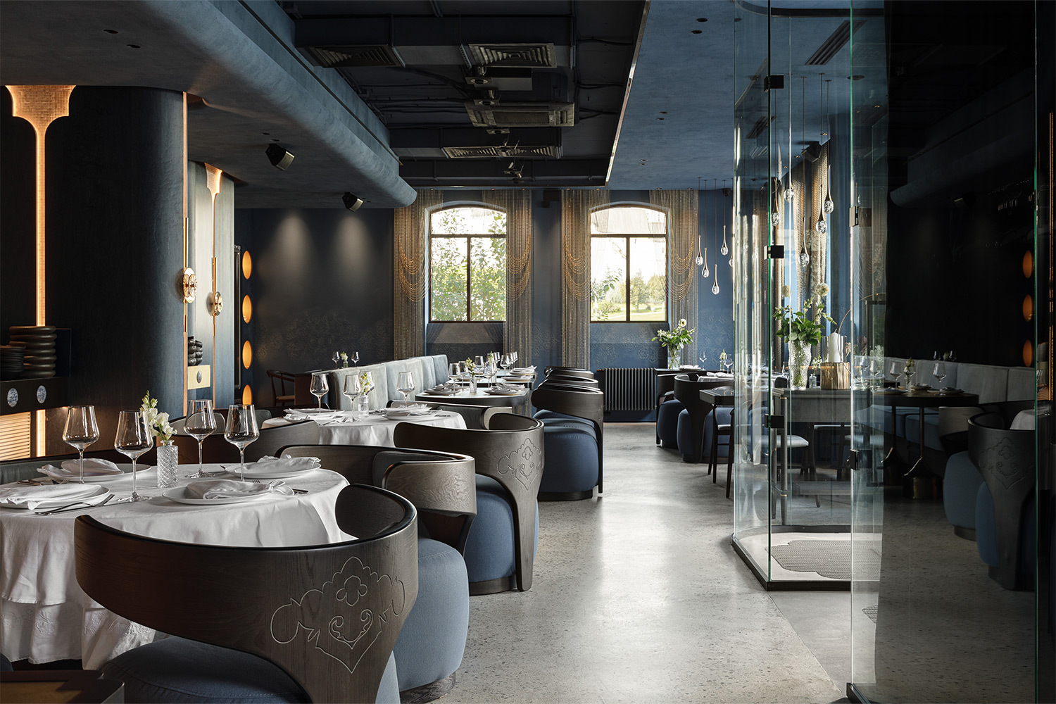 Концепция «шкатулки драгоценностей» проходит красной нитью через всё пространство ресторана. Дизайн, разработанный казанским архитектурным бюро Duplex, — это диалог современной эстетики с глубоким культурным кодом. Доминирующий насыщенный синий цвет отсылает к старинным татарским книгам и таинственному крылу птицы Умай. Каждый элемент интерьера — это работа местных мастеров: вазы, вышивка в уникальной технике «казанский шов» на текстиле, панно художницы Луизы Хамзиной. Барная стойка стилизована под браслет, колонны напоминают женский кафтан, а шторы — головное украшение «тезмэ». Даже униформа сотрудников, созданная татарским дизайнером Султаном Салиевым, и фоновая музыка, написанная специально для ресторана, продолжают эту безупречную историю.