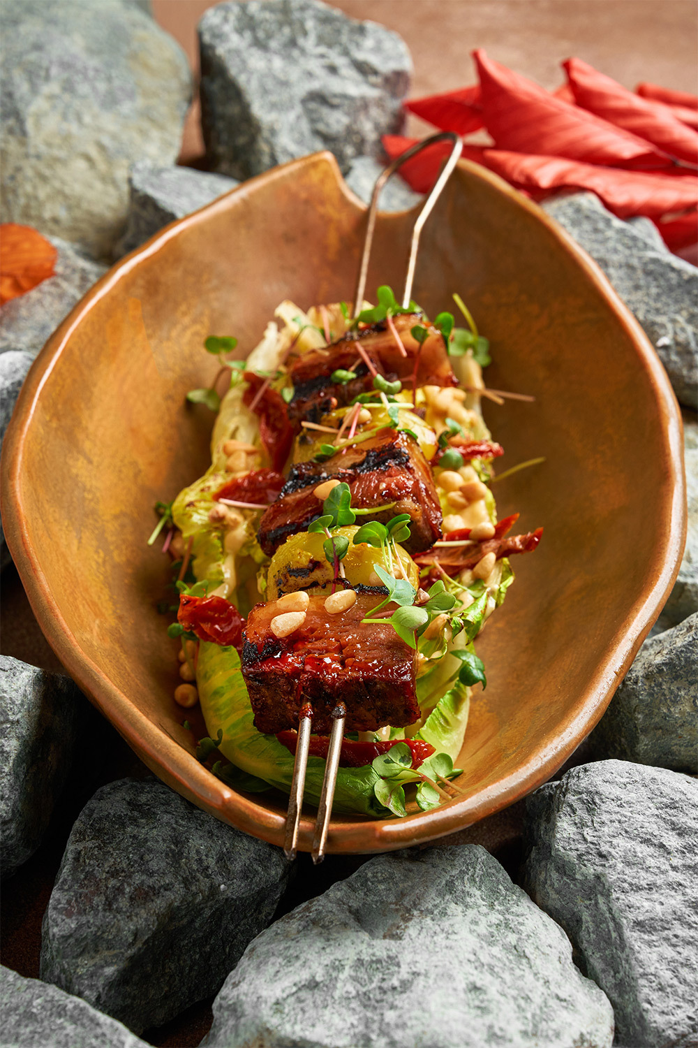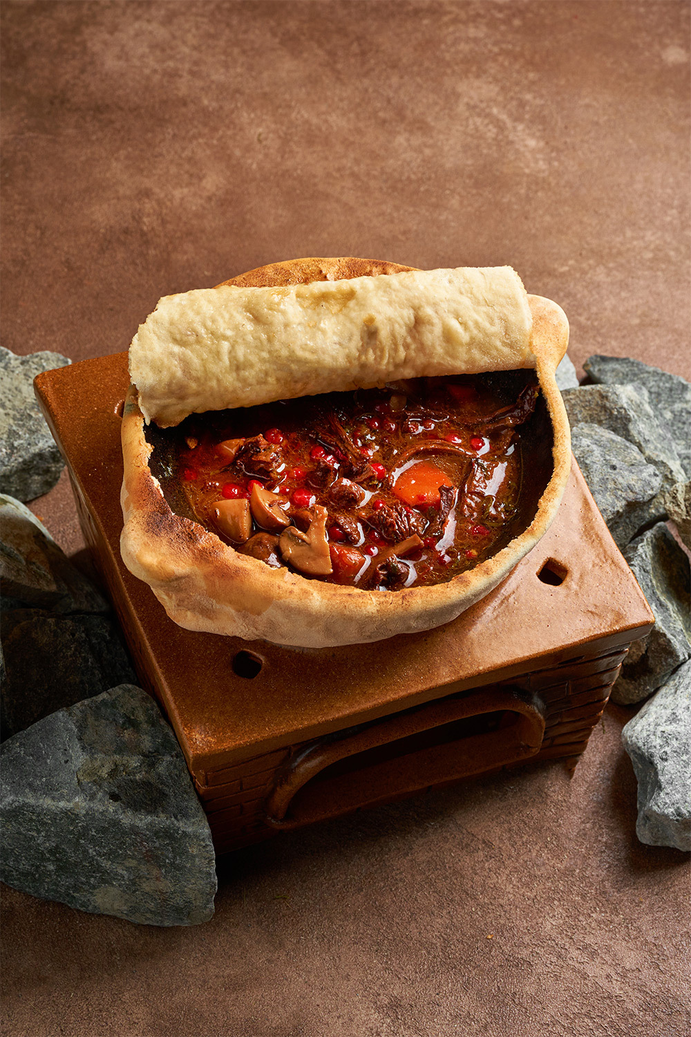 Эльдар Хахоков не просто интерпретирует рецепты, а проводит их через призму современной техники и авторского видения, превращая знакомые мотивы в кулинарное шоу. В татарской части поразили суши из тончайшего конского сала на картофельном гратене с трюфельным кремом. За Дальний Восток отвечает сугудай из нежной рыбы с острым соусом халапеньо и сладкой сальсой из ананаса и томатов. Сибирь славится не только пельменями, в «Толоке» предлагают наваристые щи с таёжными грибами и уткой конфи. Особенным Хахоков сделал и борщ по рецепту Романовых, который достался ему еще в годы работы в Москве: суп не варят, а томят в печи, чтобы он стал насыщеннее. Посетители уже оценили это блюдо: в месяц уходит более тысячи порций. Ну и Кавказ, шеф, сам родом из Кабардино-Балкарии, не мог обойти вниманием — помимо тонко выверенного ассорти шашлыков в меню отметился чеченский жижиг-галнаш с томлёными телячьими щёчками.