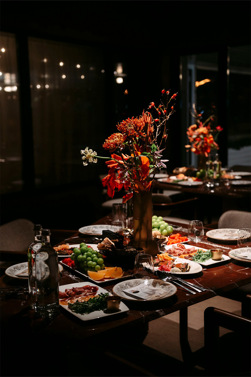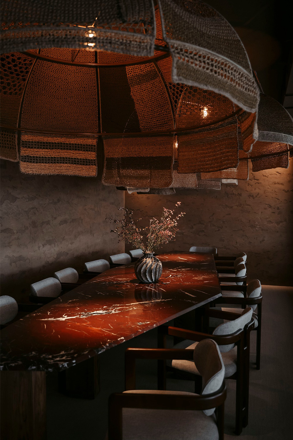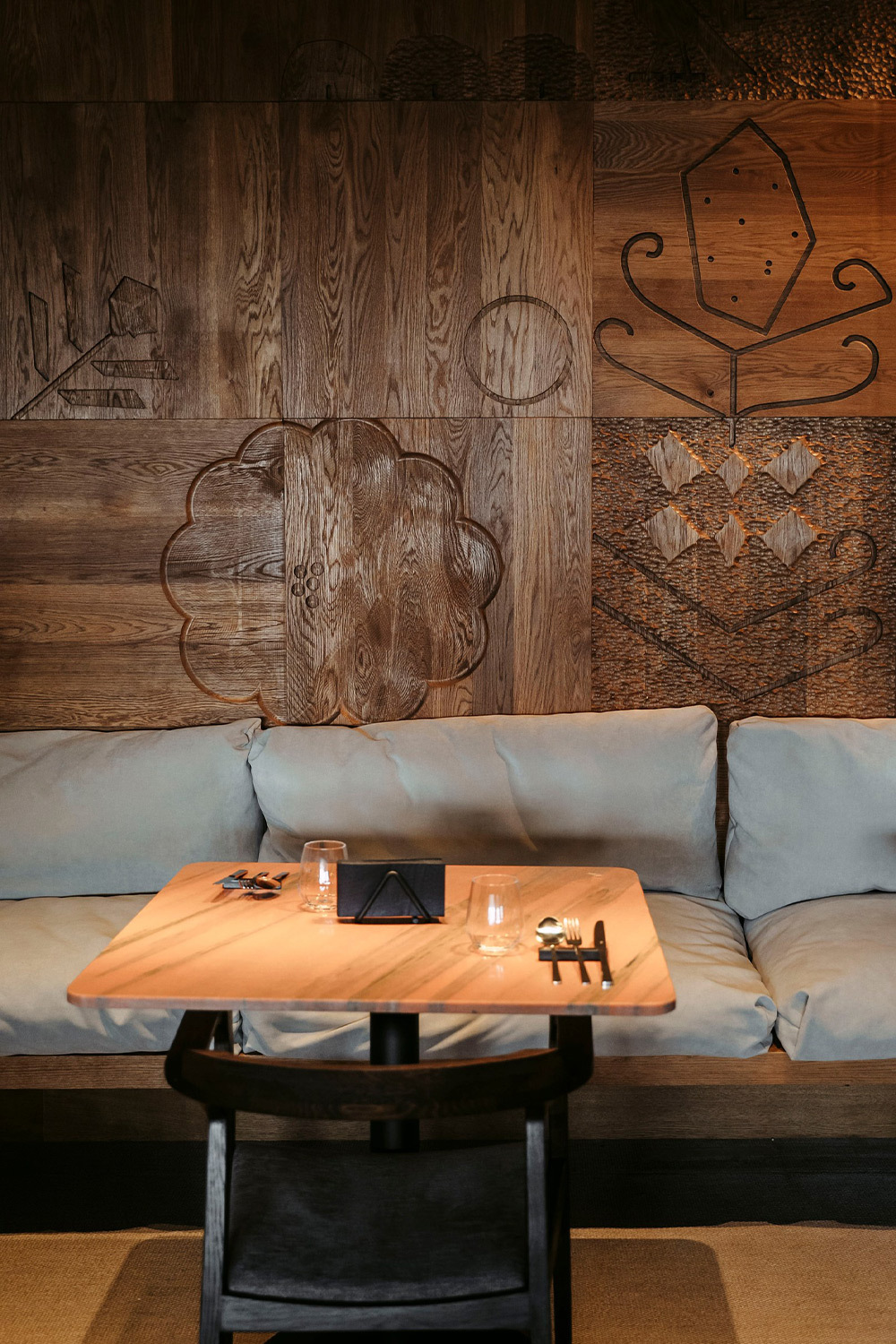 Основной зал ресторана выдержан в глубоких, «плодородных» тонах земли и теплого дерева. Классическая элегантность, мраморные столы, кресла с плетеными спинками, фонтан в центре и обилие зелени создают атмосферу солидного и одновременно уютного дома, где винный шкаф обещает отдельные открытия. А скоро добавиться и второй этаж с приватными залами.