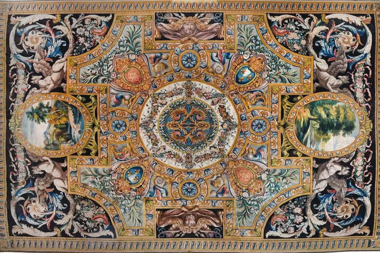В о Франции XVII века среди прочих видов искусства особое место занимало изготовление безворсовых ковров. Они представляли собой большие тканые полотна, заполненные всевозможными орнаментами, аллегориями, мифологическими и библейскими персонажами. Ковры высоко ценились европейскими монархами и аристократией не только за декоративность, но и за высокое качество исполнения: над одним изделием группа ткачей могла работать на протяжении нескольких лет. Этому процессу предшествовал ряд подготовительных этапов: сначала художник создавал эскизы, затем мастерская увеличивала их в размере будущих произведений; отбирались специальные шерстяные и шелковые нити, которые предварительно окрашивались в нужные цвета; иногда также вплетали нити из золота или серебра для достижения драгоценной фактуры. Именно поэтому как напольные ковры, так и настенные шпалеры относятся к числу самых дорогих предметов прикладного искусства.