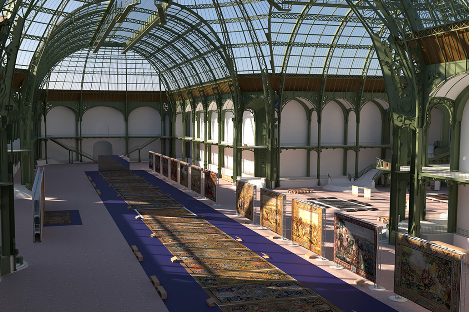 Выставка Le Trésor retrouvé du Roi-Soleil, открытая с 1 по 8 февраля, — это уникальная возможность увидеть уцелевшие ковры из коллекции Людовика XIV, собранные воедино под стеклянными сводами Гран-Пале. Столь короткий срок экспонирования — всего неделя — обусловлен, с одной стороны, особой хрупкостью материалов, с другой — предстоящей неделей моды в Париже: Гран-Пале является регулярным местом проведения модных показов бренда Chanel, ставшего одним из спонсоров этой выставки.