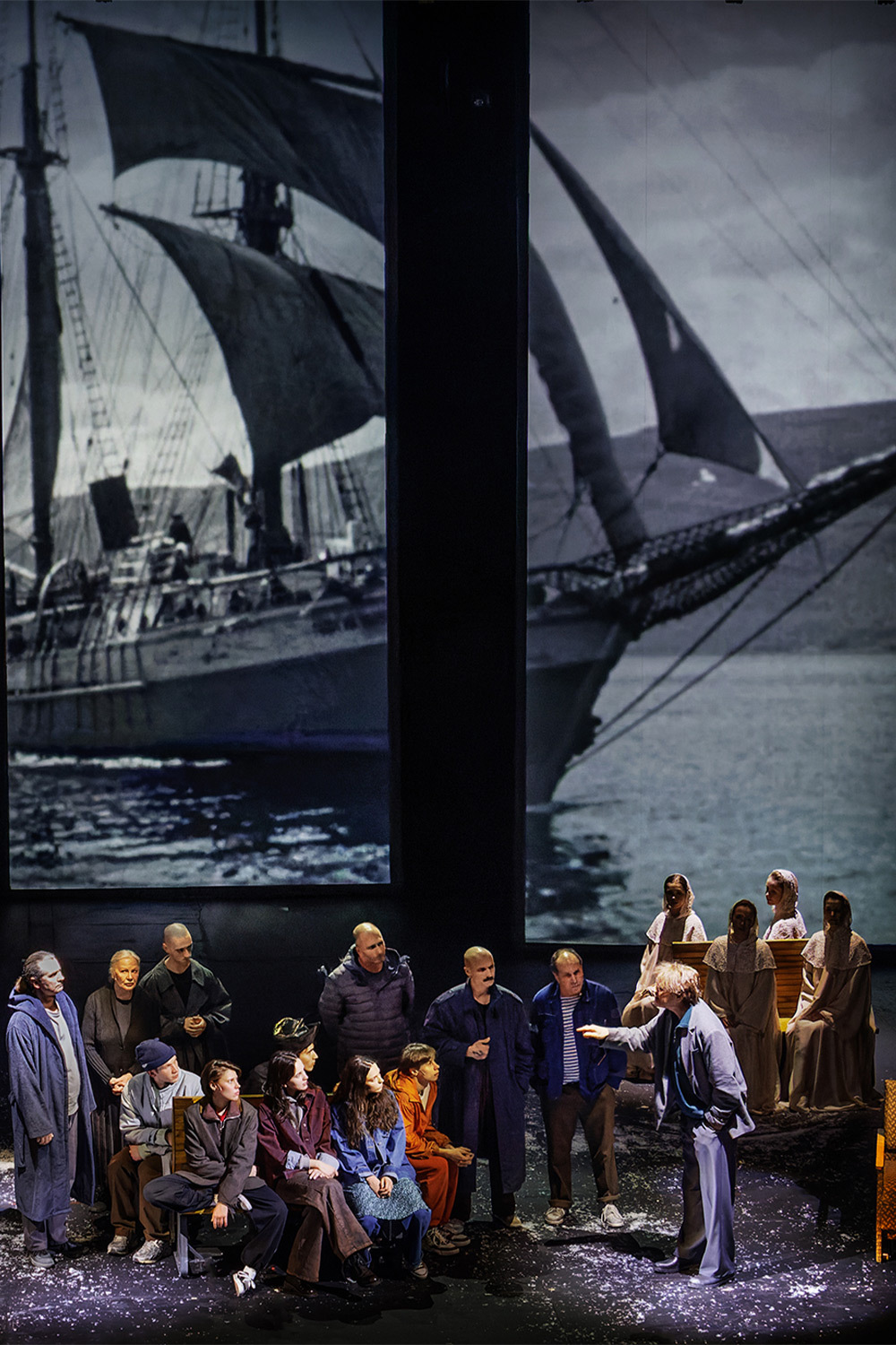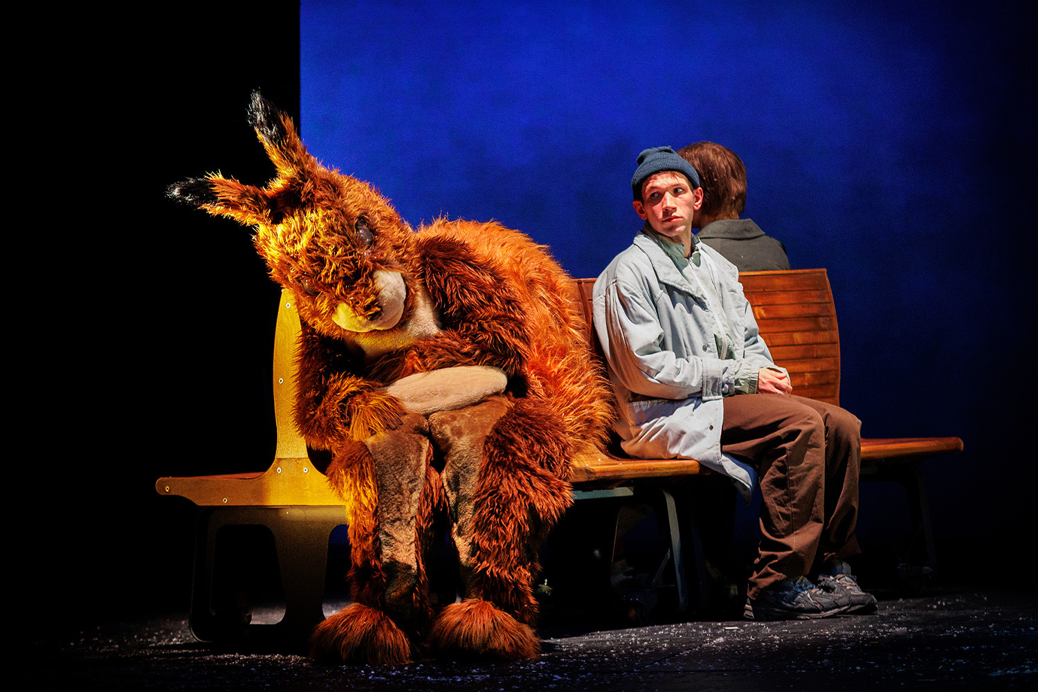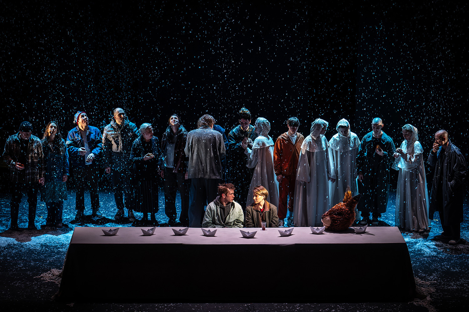 Отсюда возникает и тон спектакля — сказка-притча о предопределенности выбора, который совершается еще до появления на свет. В этом мире люди учатся в «волшебной школе», слушают лекции о превращениях, слышат пение птиц, становятся свидетелями маленьких чудес.