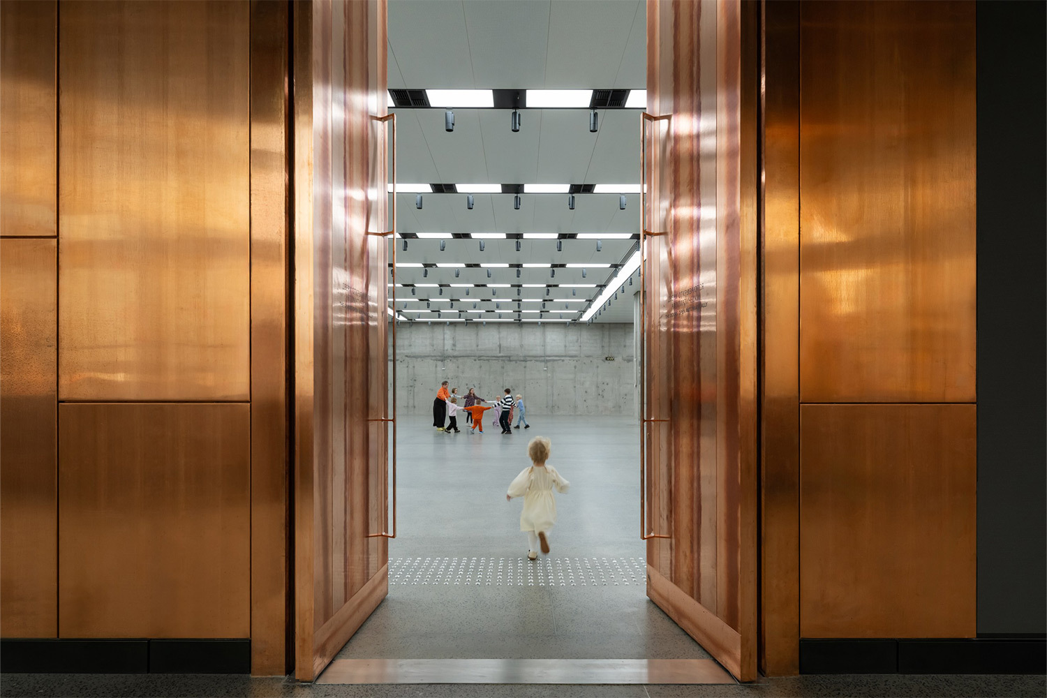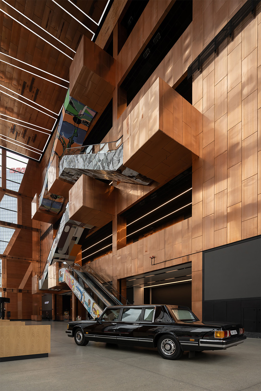 Проект – снова от лидеров, пожалуй, одного из самых известных международных бюро с русскими корнями: «СПИЧ» Сергея Чобана. Фасад здания облицевали медными листами. Ими же постройку обшили изнутри. Со временем металл будет менять цвет, внутри покрываться патиной, взаимодействовать с окружающей средой и «мутировать» – словом, это снова живая субстанция, символичный для самой концепции музея материал. За счет панорамного остекления интерьер хорошо просматривается снаружи, как бы становится продолжением жизни улиц. Для усиления эффекта оформление эскалаторов и лифтов музея тоже сделали художественным, отдав на откуп молодым стрит-арт-художникам. Такая welcome-зона, куда хочется зайти. Холл с раритетным лимузином Горбачева, выпущенным на ЗИЛе, кстати, становится продолжением истории места, начинающейся у входа в музей, где в концептуальную скульптуру превратили многометровый станок, на котором в заводские времена штамповали кузова грузовиков.