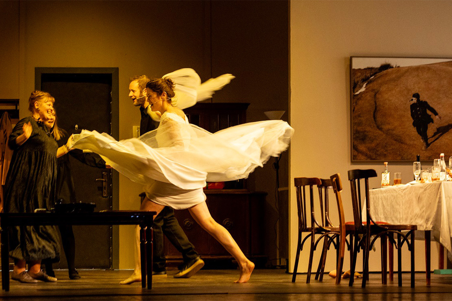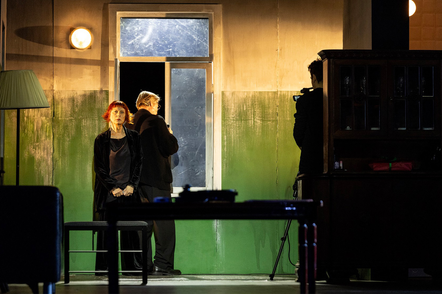 Жанр спектакля заявлен как «сон в двух действиях», так что никто не удивляется, что перманентное застолье вдруг оборачивается кинолекторием. Грань между сценой и залом стирается, герои драмы вместе со зрителями смотрят финал Д. Джармуша «Мертвые не умирают» про зомби-апокалипсис и внимают профессору, красиво рассказывающему о заложенных в фильме смыслах. Но и после титров кино не заканчивается: на экране — квартира Астрова, крупный план, он и Елена Андреевна в кровати, черно-белое кино, новая волна и постмодернизм…