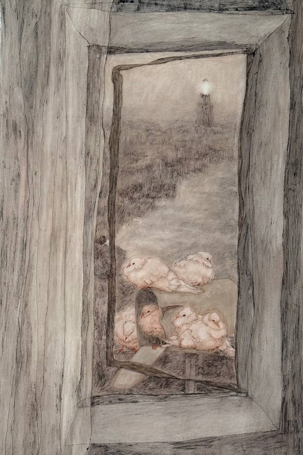 Анна Сладкова, лауреат Московской арт‑премии 2022 года в номинации «Изобразительное искусство», показывает новый для себя образ — почтовых голубей. Это не «милые птицы для настроения». Голубь у нее — знак связи и нежности, обещание, что послание дойдет. Зритель попадает в пространство тишины. На листе — окно, серый воздух, и внизу тесно сидят почтовые голуби. Вся сцена собрана из полутонов. Живопись остается очень деликатной: мягкий свет, четкие контуры, прозрачные слои краски.