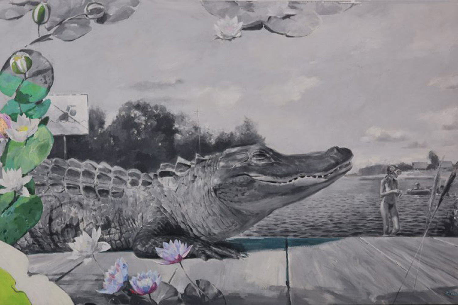 Павел Полянский, один из самых заметных художников галереи, возвращается к серии с животными в цветочной раме, которую начал 15 лет назад. Его звери и «рамки» из флоры работают как шутка с серьезным выражением лица. На одной из работ огромный крокодил лежит у воды, по краю — кувшинки, рядом угадывается почти бытовая сцена. Контраст нарочитый. Здесь важна ирония и постановка кадра: художник слегка смещает реальность, чтобы зритель поймал себя на улыбке.
