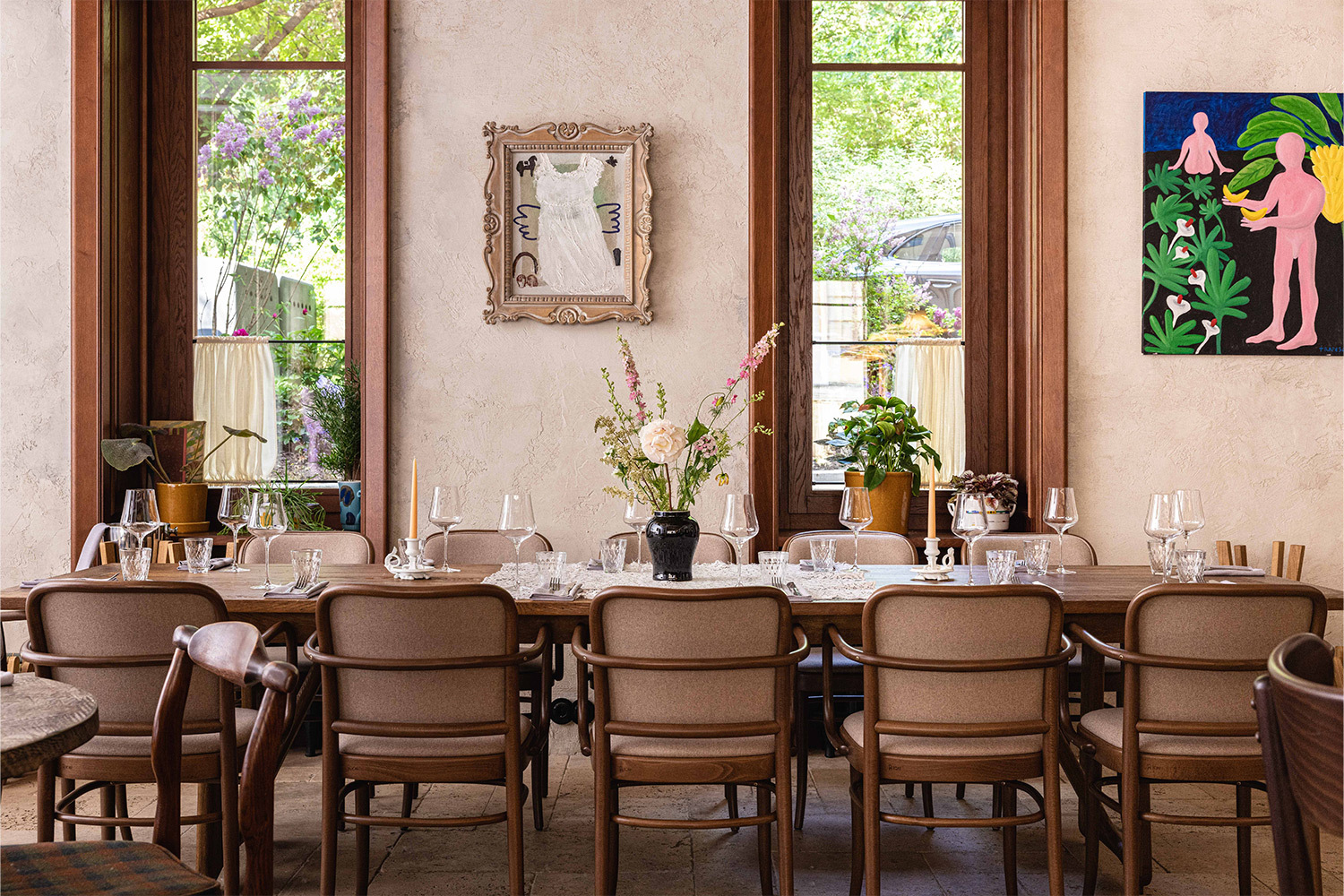 Пространство бистро состоит из двух залов. Интерьер наполнен произведениями современного искусства, и благодаря этому место ощущается скорее как стильная парижская квартира, чем классический ресторан. Здесь нет демонстративной строгости или пафоса — наоборот, атмосфера легкая и расслабленная. Часто можно встретить дизайнеров, представителей модной индустрии и творческой среды, которые приходят сюда просто на обед или же на важные события.