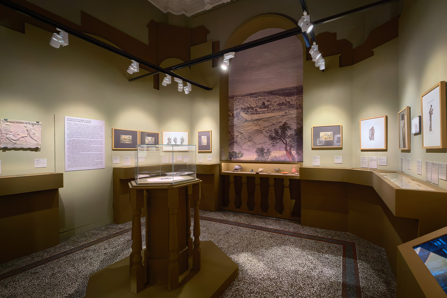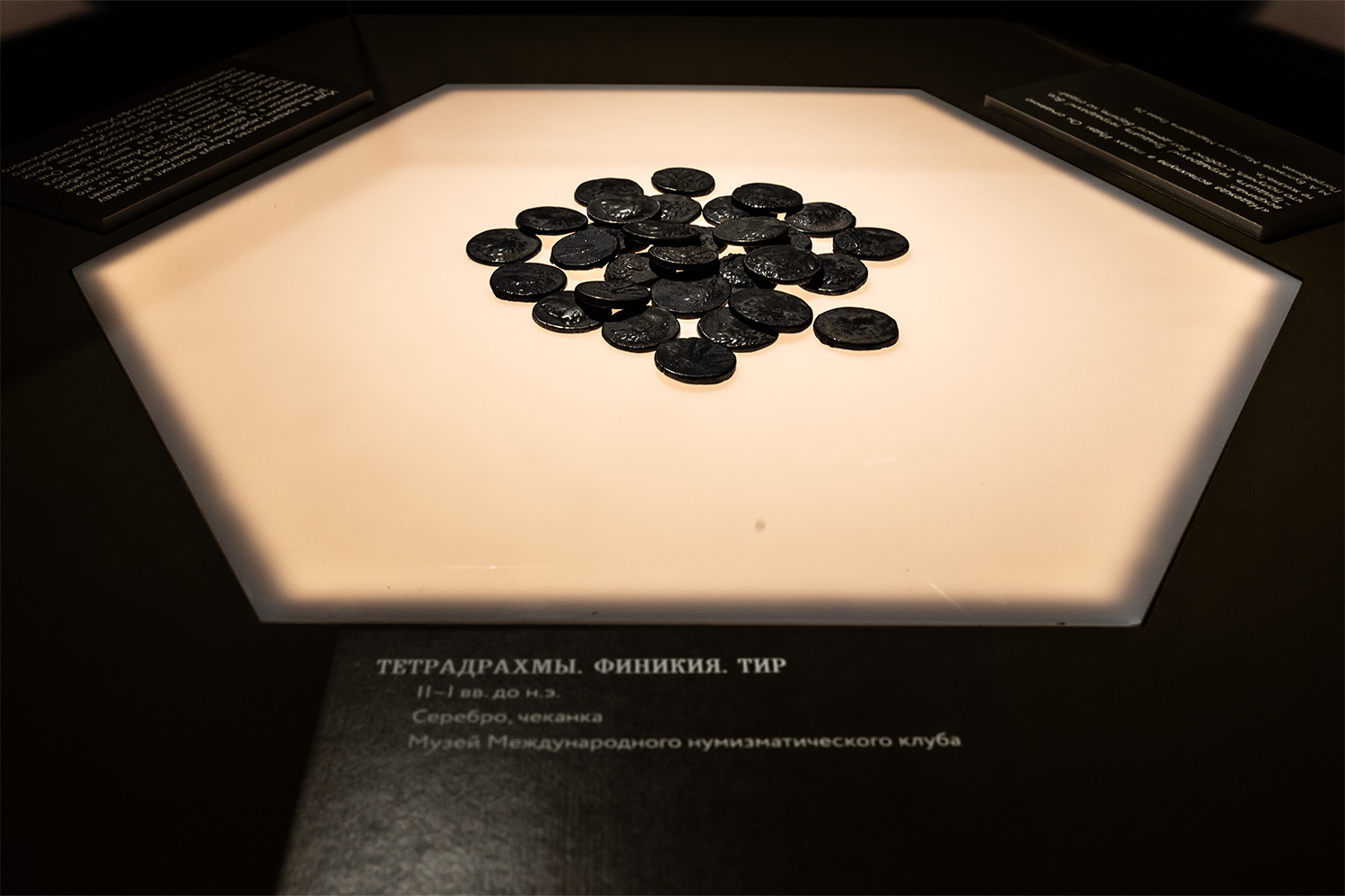 Экспозиция разделена на два блока. В первом зале собраны монеты времен Понтия Пилата: римские ауреусы и денарии, иудейские пруты, эллинистические монеты. В центре — витрина с тридцатью серебряными тетрадрахмами Тира, те самые 30 серебряников, традиционно связываемых с платой Иуде за предательство. Вокруг них — материалы о налоговой политике Римской империи и о роли менял в храме. Довольно любопытно изучить документы, что евангельские сцены, к которым обращается Булгаков, опираются на конкретные экономические реалии своего времени.