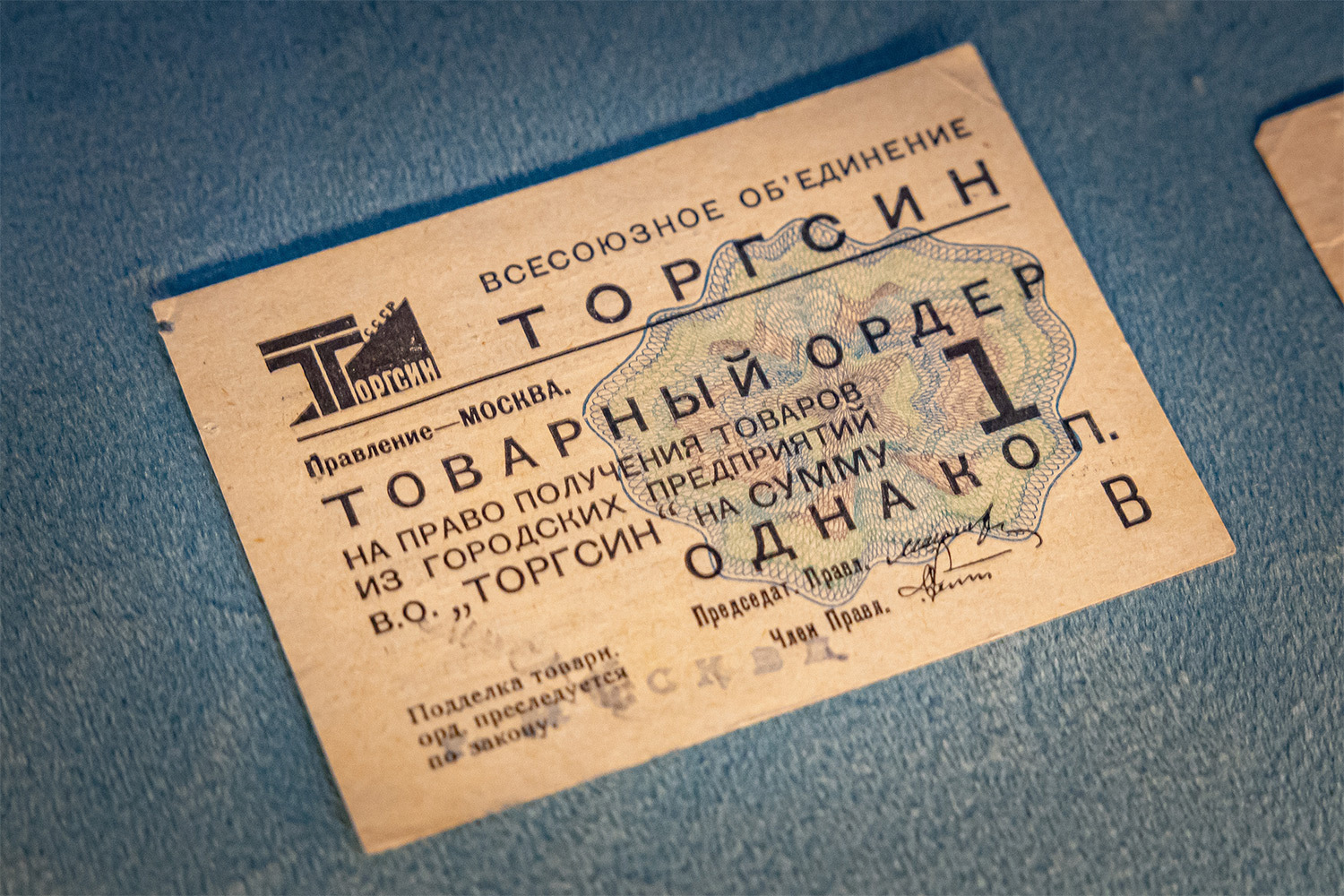 Второй зал посвящен Москве 1920–1930-х годов и советской денежной политике. Здесь представлены образцы червонцев 1922–1937 годов, эскизы денежных знаков Гознака, а также редкие товарные ордера магазина «Торгсин», где советские граждане обменивали золото и валюту на товары. Показано, как за несколько лет через эту сеть прошло значительное количество средств и как она повлияла на повседневную жизнь горожан. Отдельный акцент сделан на том, что «Торгсин» и новая валюта отражены в дневниках и биографии Булгакова, что сближает экспонаты с текстом романа.