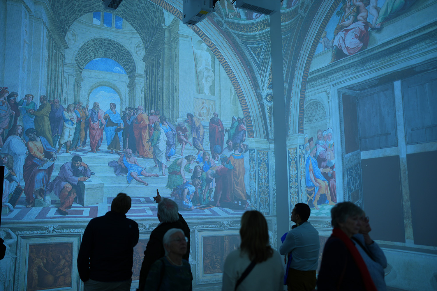 Продолжением этого раздела становится пространство с проекцией ватиканских фресок Рафаэля, знаменитых Станц Апостольского дворца. Поскольку фрески не могут покинуть Ватикан, музей предлагает иммерсивное решение: на стены проецируются «Афинская школа» и другие росписи, создавая визуальный диалог со шпалерами в соседнем зале.