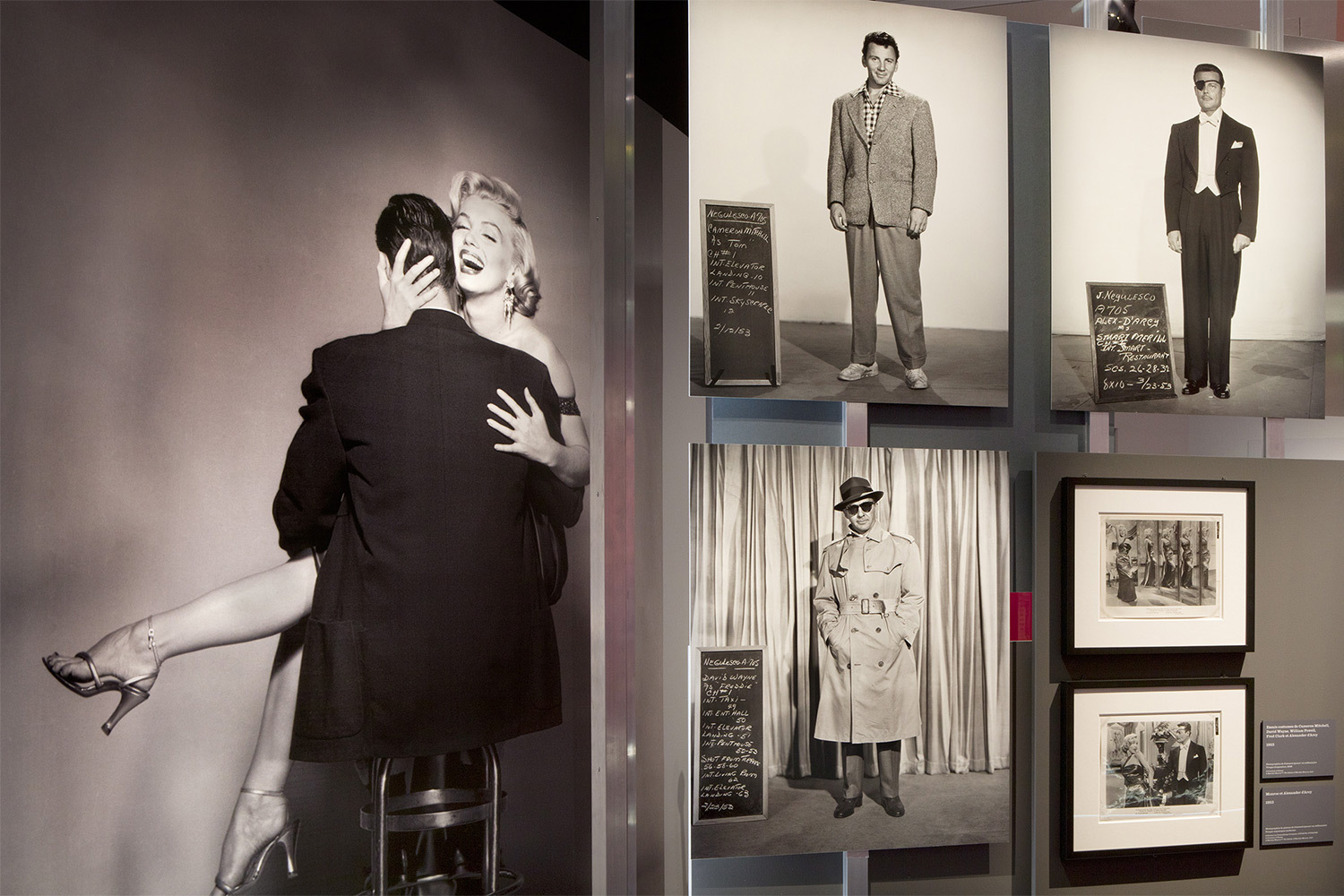 Экспозиция выстроена хронологически — от первых контрактов с Fox в конце 1940-х до последних ролей начала 1960-х. Витрины с костюмами соседствуют с рабочими материалами: сценариями с пометками, фотографиями со съемок, видеохроникой.