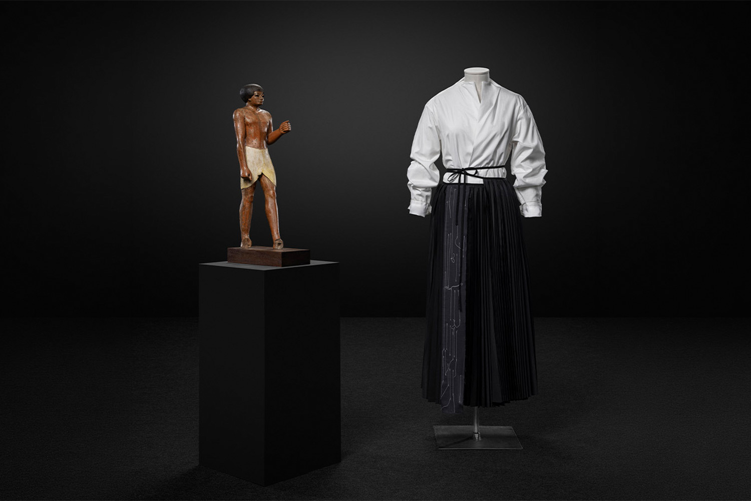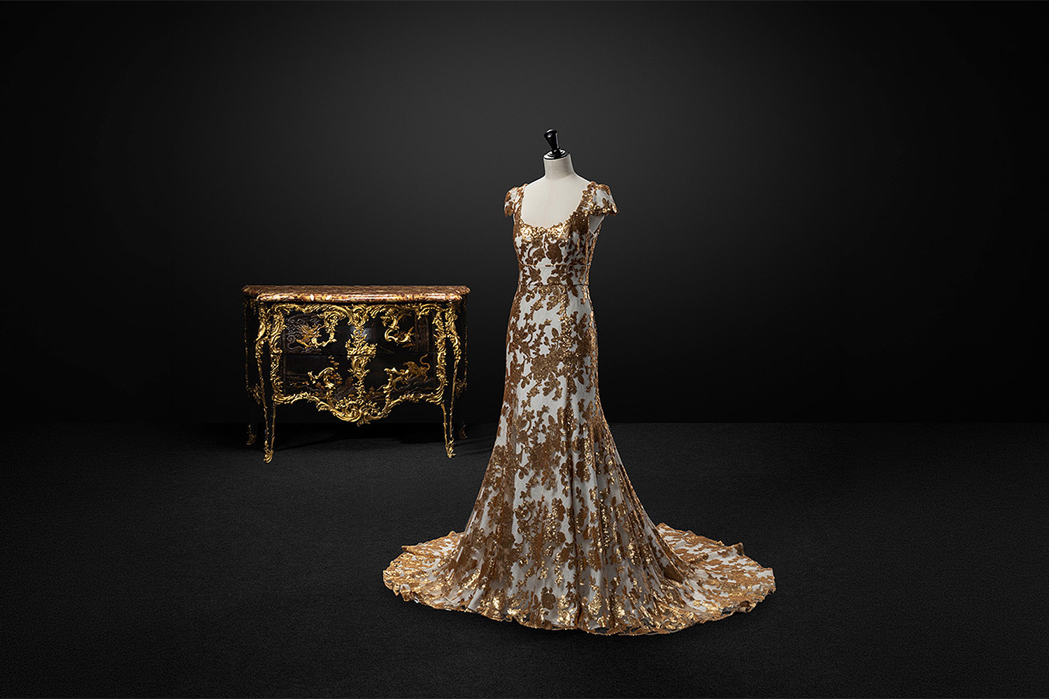 Античная ваза рифмуется с платьем Givenchy, японская лакированная шкатулка — с нарядом Dior, а египетская погребальная маска оказывается неожиданным собеседником фантасмагорических творений Guo Pei. Вивьен Вествуд с ее историческими принтами, корсетами и драпировками из коллекций Pirates и Mini-Crini встает в один ряд с живописью Ватто и интерьерным искусством рококо. Ли Александр Маккуин — с японской гравюрой: острые силуэты, объемные рукава, готические текстуры как будто вышли из тех же восточных принтов.