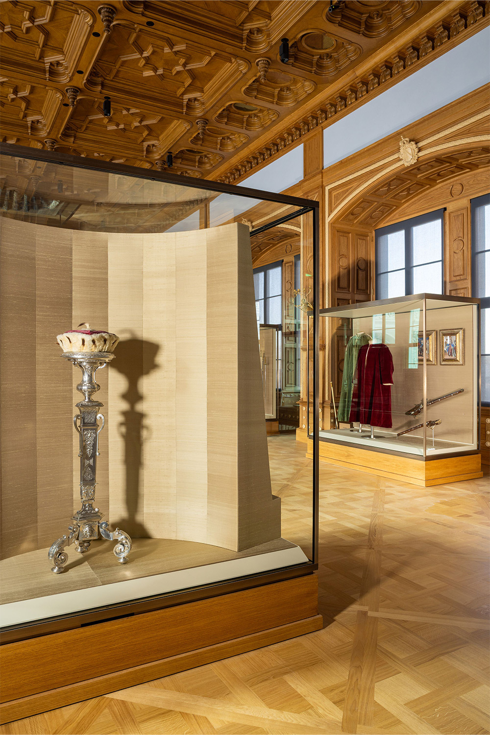 Зал государственных аудиенций посвящен уже не празднику, а самой идее власти. Темные деревянные панели задают здесь иной тон — торжественный и официальный. Здесь собраны гербы, регалии, мантии, медали и личные вещи саксонских правителей. При этом важен и сам исторический контекст помещения: именно здесь в 1831 году была провозглашена первая саксонская конституция. Поэтому выставка в этом зале рассказывает не только о символах монархии, но и о том, как постепенно менялось само представление о власти.