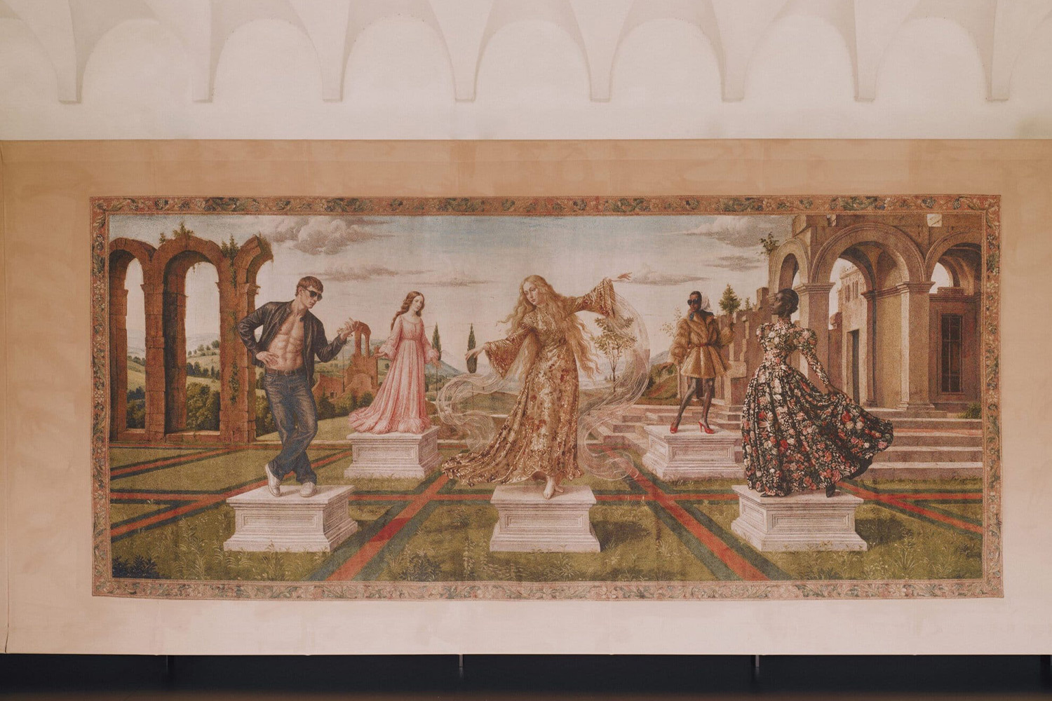 Экспозиция построена как последовательность сцен: исторический монастырский двор, сад с отсылкой к Gucci Flora и гобелены, которые переосмысляют визуальный язык Gucci. Здесь нет сухой хронологии — вместо этого прошлое подается как материал для воссоздания будущего. Отдельный жест — включение образа самого Демны в повествование, что делает выставку не только про архив, но и про текущую стратегию.