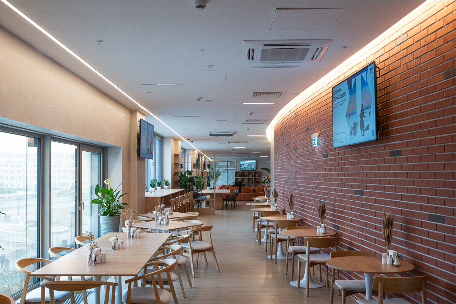 Пространство находится на третьем этаже нового корпуса и устроено как спокойная зона внутри музея, куда можно зайти после выставки — или отдельно, без покупки билета. Гостиная разделена на две части: кафе и зону с книгами. Здесь можно сесть с кофе, полистать каталог, поработать за столом или обсудить только что увиденное. Для музея это важное изменение: посетителю предлагают не просто пройти маршрут по залам, а остаться в здании дольше и провести время в более свободном режиме.
