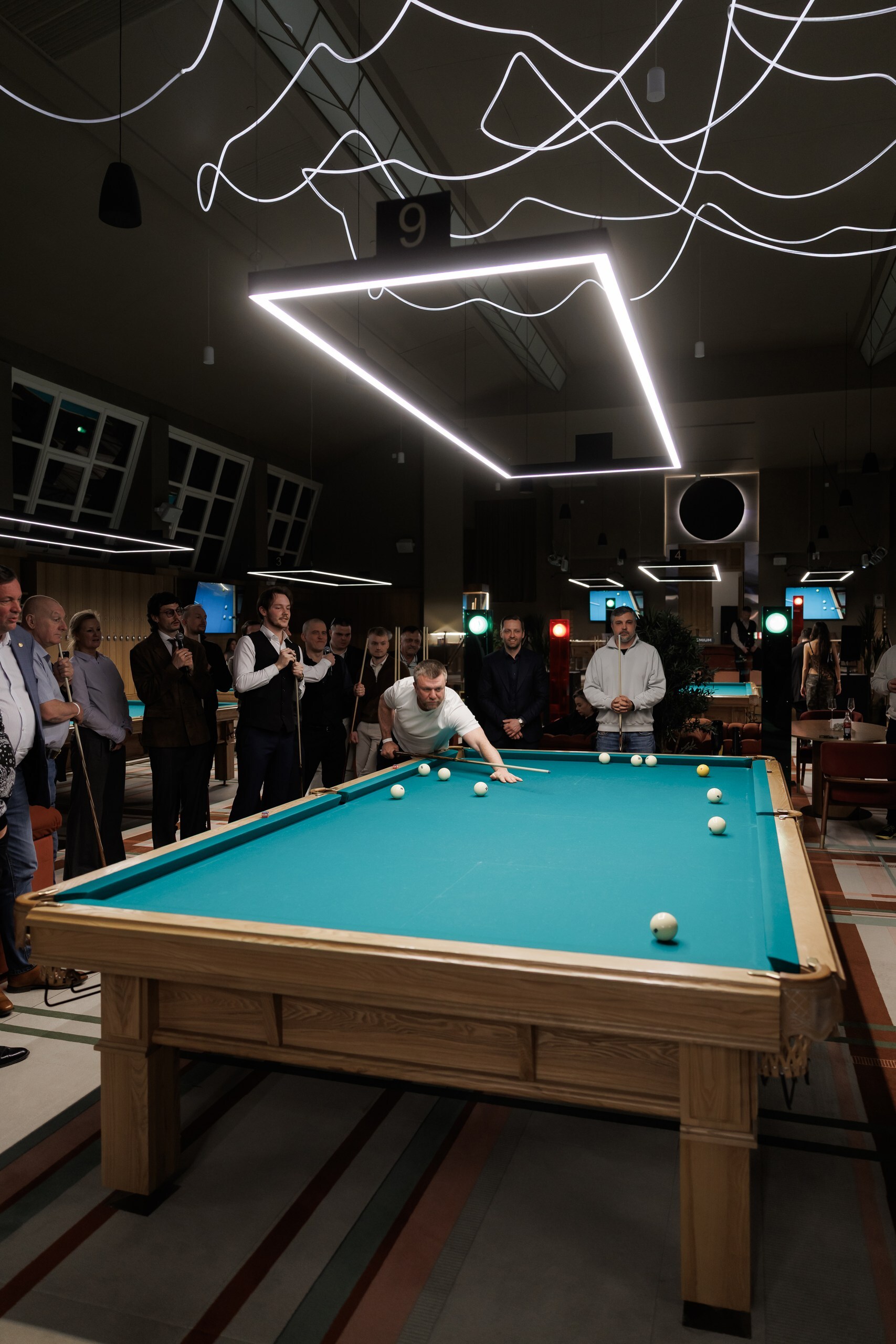 Главным событием вечера стал бильярдный турнир с участием мировых звезд. За центральным столом встретились восьмикратный чемпион мира по русскому бильярду Евгений Сталев и победитель первенства мира Елисей Ануфриев. Они сразились в парах с клиентами Т-Банка. Победители под бурные овации гостей вечера получили в подарок бильярдные кии ручной работы.