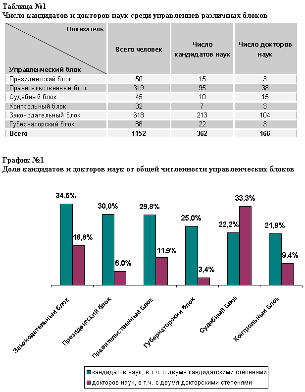 По подсчетам исследователей "Рейтора", доля докторов наук оказалась наивысшей в судебном блоке (33,3%) и самой низкой – в губернаторском блоке (3,49%), наивысшим по обладателям кандидатских степеней – в законодательном блоке (34,5%), а самым низким – в контрольном блоке (21,9%) (см. график №1, где красным обозначены доктора наук, а зеленым – обладатели кандидатских степеней).