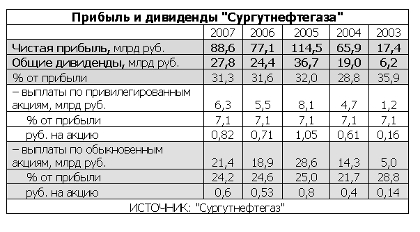 Общие дивиденды "Сургута" за последние пять лет составляли в среднем около 30% прибыли. Если пропорция сохранится, общие выплаты могут составить около 43 млрд руб., в полтора раза больше, чем за 2007 г. И тогда компания побьет собственный рекорд, поставленный в 2005 г.: общие выплаты тогда составили 36,7 млрд руб.
