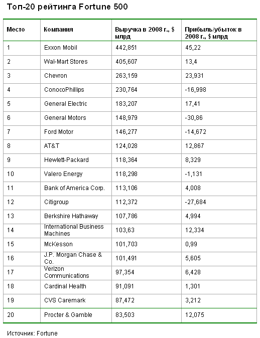 Журнал Fortune опубликовал на сайте ежегодный рейтинг 500 крупнейших компаний США по выручке. Первое место занял нефтяной гигант ExxonMobil ($442,85 млрд), поменявшийся местами с сетью супермаркетов Wal-Mart Stores ($405,61 млрд). Wal-Mart продолжает развивать бизнес за счет выгодной позиции дискаунтера: потребители, сокращая расходы, ищут более дешевые товары. Wal-Mart остается одной из немногих компаний, увеличивающих штат на фоне общего роста безработицы: вакансии в компании исчисляются тысячами.