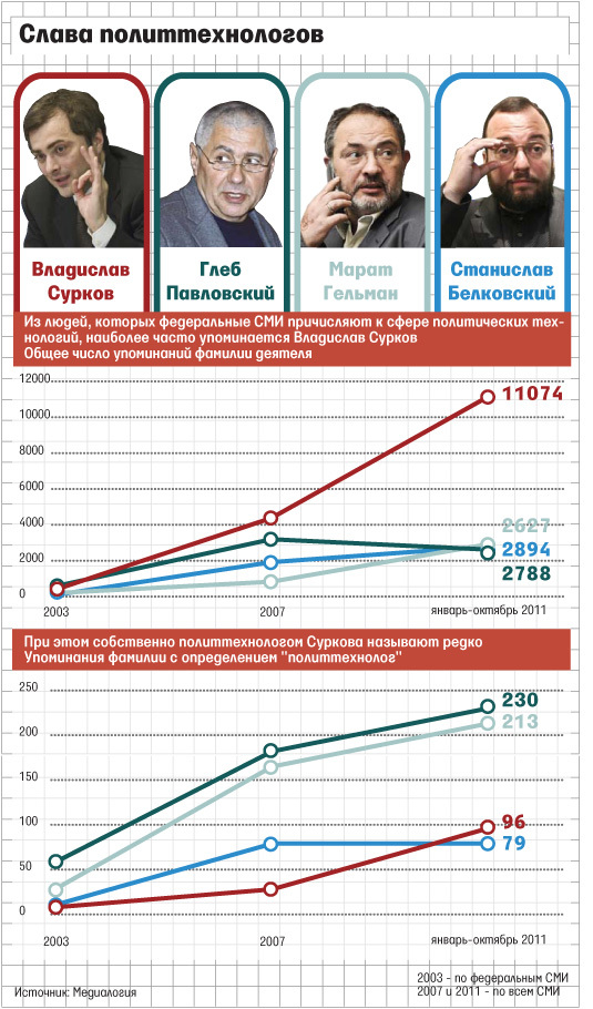 По просьбе Vedomosti.ru компания "Медиалогия" подсчитала, сколько раз перед выборами в Госдуму 2003, 2007 и 2011 гг. упоминались в СМИ российские политтехнологи. Выяснилось, что Владислав Сурков - самый авторитетный представитель этой профессии, хотя в связке со словом "политтехнолог" его фамилия употребляется редко. Однако в том, что Суркова экспертное сообщество воспринимает именно как политтехнолога, сомневаться не приходится - в 2011 г. по количеству публикаций в российских СМИ, в которых журналисты представляли его именно как политического имиджмейкера, Сурков уступил лишь двум политтехнологам (см. нижний график).