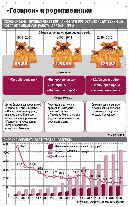 Что же получилось? «Ведомости» выяснили, что подрядчиков и посредников «Газпрома», связанных с родственниками его топ-менеджеров, меньше не стало. Не уменьшился и денежный поток, проходящий через компании этих родственников. Правда, цены на газ и, как следствие, выручка «Газпрома» и его инвестпрограмма с тех пор тоже значительно выросли (см. инфографику).