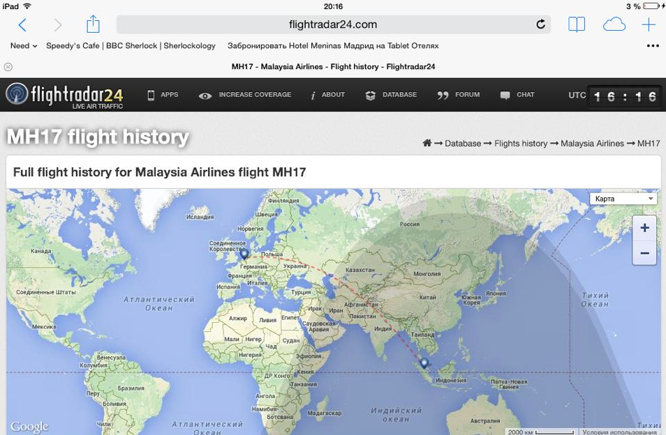 Boeing 777-200 авиакомпании Malaysia Airlines рейсом MH 017 из Амстердама в четверг потерпел крушение в 80 км к востоку от украинского Донецка близ поселка Торез, на территории Украины, контролируемой силами самопровозглашенной Донецкой народной республики (ДНР). Вероятная причина катастрофы - поражение ракетой "земля - воздух", сообщили несколько источников. Лайнер должен был пересечь границу примерно в 17.25 мск, сообщил "Интерфакс" со ссылкой на источник в авиационных кругах. «За 50 км до вхождения в воздушное пространство России начал снижаться, впоследствии его обнаружили горящим на земле на территории Украины», - рассказал собеседник "Интерфакса".