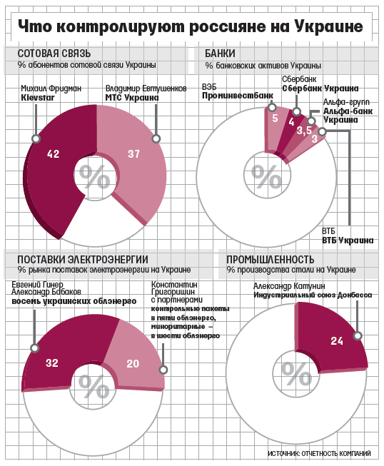 Российские инвесторы контролируют почти весь украинский рынок сотовой связи. По данным Informa Telecoms & Media, на декабрь 2013 г. более 42% на нем занимала «МТС Украина», принадлежащая российской МТС (контролируется АФК «Система»), а более 37% - «Киевстар», принадлежащий Vimpelcom, совладельцем которого является «Альфа-групп».