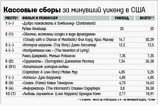 Зомби – это весело. Зомби – это аттракцион. Причем в комедии «Зомбилэнд» – в буквальном смысле. Герои отправляются в луна-парк, где устраивают что-то вроде сафари. Комедия, снятая всего за $23,6 млн, заработала с ходу $25 млн. Это второй результат среди зомби-хорроров после ремейка «Рассвета мертвецов», снятого Заком Снайдером ($26,72 млн).