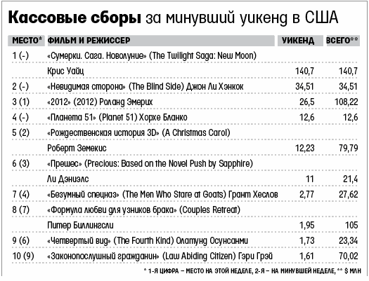 Второе место досталось назидательному кино «Невидимая сторона», в котором Сандра Буллок воспитывает бездомного афроамериканца, – $34,51 млн. Симпатичный и остроумный мультфильм «Планета 51», третья новинка десятки, стартовал довольно скромно – $12,6 млн. Историю сочинил Джо Стиллман, автор трех «Шрэков», так что можно было ожидать и большего. Впрочем, низкие сборы в данном случае ничего не говорят о качестве фильма.