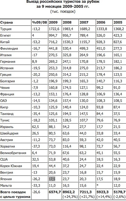 Выезд российских туристов за рубеж за 9 месяцев 2009-2005 гг. (Ростуризм)