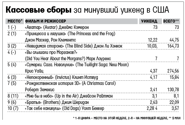 Еще одним новичком десятки стала драма «Вы слышали про Морганов?», в которой Сара Джессика Паркер и Хью Грант изображают супругов, пытающихся спасти распадающуюся семью. Фильм начал прокат со скромных $7 млн. И на 8-е место поднялась еще одна драма – «Мне бы в небо» с Джорджем Клуни в роли корпоративного менеджера, проводящего полжизни в самолете, – $3,1 млн за выходные. Снег очевидно нагадил и этим скромным премьерам, правда не в аватаровских масштабах.