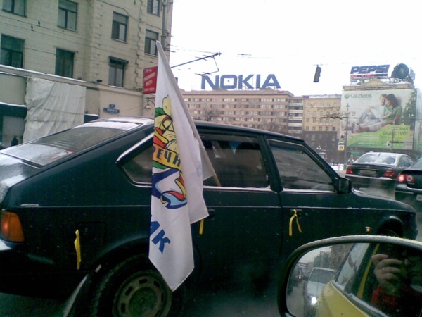 Жители поселка "Речник" устроили пробку на Тверской. Около полудня на Тверской появились несколько автомобилей с флагами белого цвета и желтыми лентами на дверях. Корреспондент "Ведомостей" заметил среди протестующих "Москвич 2141" и Toyota Corolla. На части флагов написано "Речник", на других изображен логотип партии "Яблоко".