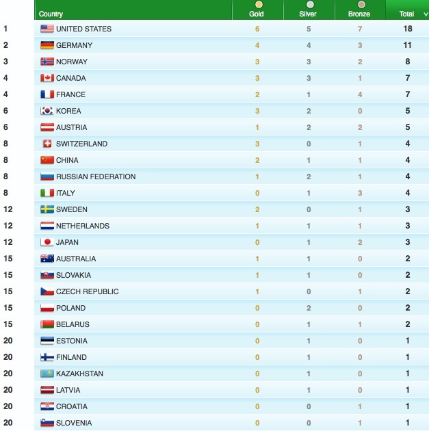 Таким образом, от лидера Ванкувера - команды США - россиян отделяют 14 побед. У американцев теперь 18 медалей: 6 золотых, 5 серебряных и 7 бронзовых. У команды Германии 11 медалей, она на втором месте. На третье место вырвалась Норвегия (8 медалей), потеснив команду Франции (7 медалей). Четвертое место французы делят с хозяевами Олимпиады - канадцами (см. таблицу).