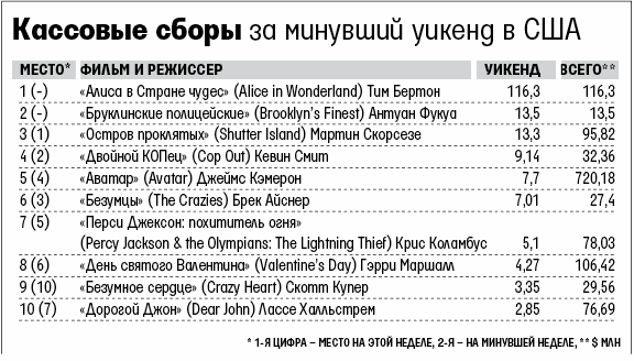 Бесспорным же победителем прошедших выходных с громадным отрывом стала «Алиса в Стране чудес», заработавшая $116,3 млн. И это лучший старт в этом году. «Аватар», например, собрал в начале января $68,49 млн. Правда, к тому моменту он уже шел третью неделю. Его премьера в декабре, напомним, тоже была менее успешной, чем у «Алисы» ($77,02 млн). Погода помешала Кэмерону с ходу штурмовать 100-миллионную отметку. Бертон же взял ее в этом году первым. Впрочем, за свой успех он должен опять-таки поблагодарить «Аватара», поскольку трехмерная картинка будет теперь пользоваться повышенным спросом, да и билеты на нее стоят дороже.
