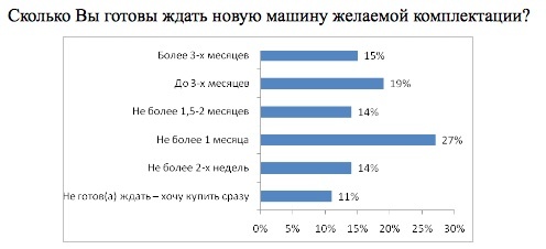 Большинство (52%) респондентов признались, что не готовы ждать машину желаемой комплектации дольше одного месяца. Причем 11% хотят получить машину сразу, 14% – подождать не более двух недель, 27% - не более месяца. 14% готовы ждать новый автомобиль не более двух месяцев, 19% - до трех месяцев и лишь 15% - свыше этого срока.