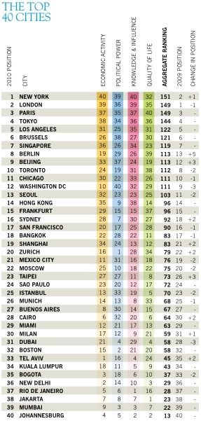 Рейтинг самых влиятельных городов мира составляется по четырем основным критериям: экономическая активность, политическое влияние, интеллектуальный капитал и качество жизни. По каждому из критериев в отдельности лидерами стали Нью-Йорк, Вашингтон, снова Нью-Йорк и Париж. В итоговый рейтинг входит 40 городов. Совокупность оценок по каждому из четырех критериев определяет позицию города в общем рейтинге.