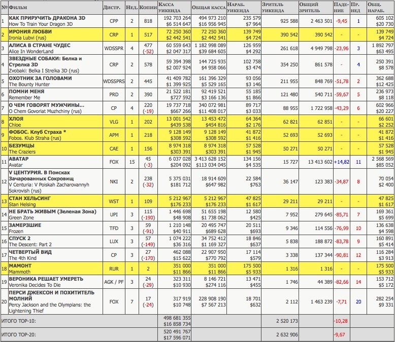 Третью позицию по сборам в российском прокате вторую неделю подряд удерживает сказка "Алиса в Стране чудес". Этот 3D-шедевр Тима Бертона с 25 по 28 марта заработал на 477 копиях (на 52 меньше, чем неделей ранее) 60,56 млн руб. ($2,047 млн). Тем временем кассовые сборы "Алисы" по итогам первого месяца демонстрации в России составили 1,183 млрд руб. ($39,685 млн). К слову, 3D-шедевр Джеймса Кэмерона "Аватар", с которым постоянно сравнивают бертоновскую "Алису", за первый месяц проката в России выручил вдвое больше - 2,323 млрд руб. ($76,923 млн). Так что рекордами "Аватара 3D" "Алисе 3D" лучше не грезить - к 29 марта за 15 недель показа в России фантастический боевик о приключениях землян на планете Пандора заработал 3,414 млрд руб. ($113,034 млн). Этот самый успешный блокбастер всех времен и народов до сих пор занимает 11-ю строчку отечественного проката.
