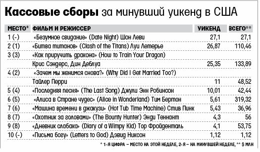 За первое место разыгралось настоящее сражение. Очень близко друг от друга расположились три лидера. «Безумное свидание» идет впереди с небольшим отрывом – 27,1 млн. «Битва титанов» дышит буквально в затылок – 26,87 млн. И чуть больше, но не радикально отстает мультфильм «Как приручить дракона» – 25,35 млн. Драматизм ситуации усиливается, если знать, что по итогам пятницы побеждало «Безумное свидание» – 9,3 млн. В субботу сильнее выступила «Битва титанов» с 11,2 млн. А в воскресенье вперед вырвался мультфильм «Как приручить дракона» – 7,8 млн. По этим цифрам довольно точно можно представить, как менялась публика в кинотеатрах: в пятницу – парочки, в субботу – парочки и подростки, в воскресенье – подростки и родители с детьми.