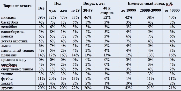 Судя по результатам опроса Superjob.ru, плаванием чаще занимаются женщины (16% против 12% мужчин). Этим видом спорта больше увлекаются люди с высокими доходами: лишь 12% с зарплатой ниже 20 000 руб. в месяц и 16% - с зарплатой выше 40 000 руб. (подробнее - см. таблицу). На втором месте по популярности у наших соотечественников футбол, которым занимаются 20% мужчин и 1% женщин. Третье место в рейтинге спортивных пристрастий делят лыжи и коньки, которыми увлечены по 6% россиян. Лыжами чаще занимаются мужчины (7% против 4%), а коньками - женщины (7% против 5%).