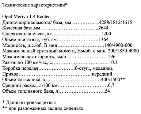 Технические характеристики Opel Meriva
