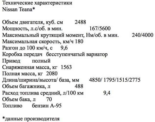 Технические характеристики Nissan Teana