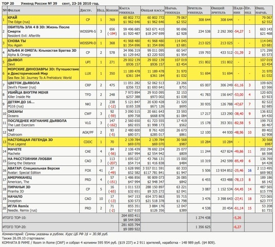 Две недели подряд возглавлявшая рейтинг "Обитель зла-4" с Милой Йовович откатилась на вторую позицию, на 656 копиях заработав 59,497 млн руб. ($1,92 млн). На третьей строчке оказалась премьера американской комедии с Сигурни Уивер под названием "Снова ты", выручившая на 368 экранах 41,968 млн руб. ($1,355 млн).