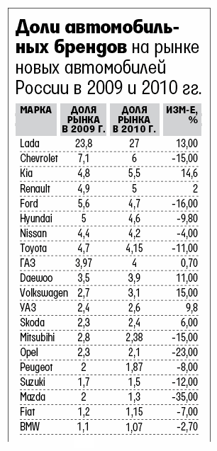 Марки из двадцатки лидеров увеличили объемы продаж за год на 11–49%. В минусе лишь Mazda: она реализовала 24 926 автомобилей – на 19% меньше, чем в 2009 г. Но большинство лидеров не сумело выиграть на восстановлении рынка: у 13 из 20 марок доля на рынке новых легковых и коммерческих автомобилей уменьшилась по сравнению с 2009 г. (см. таблицу на стр. 10).