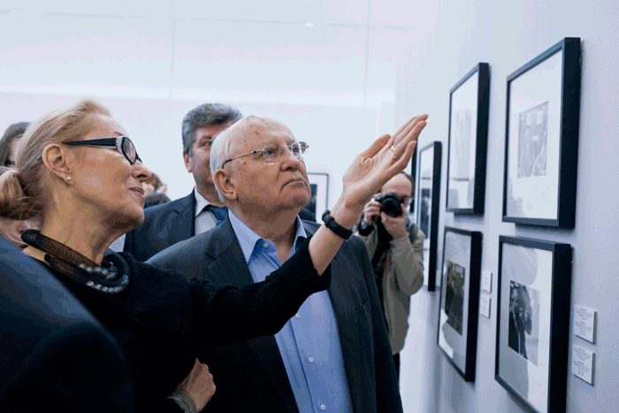 Михаил Сергеевич приехал на вернисаж в Манеж, не зная, что там увидит. Сначала долго разговаривал с журналистами. От имени «Ведомостей» был задан вопрос про чувства, которые он испытывает, глядя на старые фотографии. В ответ первый и последний президент СССР вздохнул и ответил, что старые фотографии – «они, конечно, факт, воспоминания», вот посмотрел он на фотографии Раисы и свои – есть разница. Потом пошутил, возможно не в первый раз, что восьмидесятилетие справлять неинтересно, столетие – другое дело. Затем, ведомый директором Московского дома фотографии Ольгой Свибловой, медленно обошел экспозицию. И опять долго говорил, что и как хотел сделать для страны, развенчивал мифы о своем правлении.