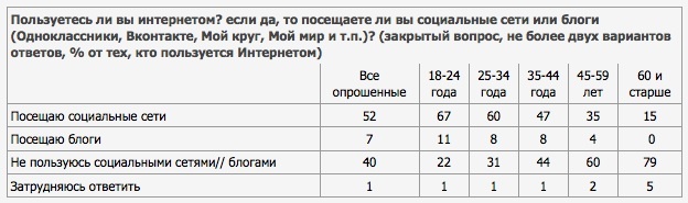 В социальных сетях сегодня зарегистрировано более половины (52%) российских интернет-пользователей, утверждают специалисты Всероссийского центра изучения общественного мнения (ВЦИОМ) по результатам опроса 5-6 февраля 2011 г. 1600 человек в 138 населенных пунктах в 46 областях, краях и республиках России.