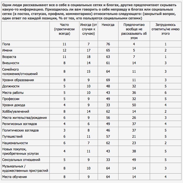 Сообщать о себе в социальных сетях и блогах неправду хотя бы однажды приходилось половине пользователей этих ресурсов (51%). В первую очередь к этому склонны 18-24-летние респонденты (59%). Чаще всего подписываются не своим именем и врут про возраст (по 29%), дают неверные сведения о своем семейном положении (23%), внешности и хобби (по 22%). Несколько реже неверными могут оказаться данные о поле пользователя, музыкальных и художественных пристрастиях (по 18%), уровне образования и месте обучения (по 17%), месте жительства, месте работы и занимаемой должности, покупках и услугах (по 15%), профессии, сексуальных отношениях (по 14%), уровне доходов, национальности (по 13%). Наименее распространены случаи, когда пользователи социальных сетей и блогов искажают информацию о своих политических и религиозных взглядах (11 и 10% соответственно).