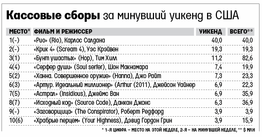 Зритель предпочитает мультфильмы: победу компьютерной анимации над живым кино вновь утверждает «Рио», возглавивший прокатную таблицу с $40 млн. Любовь голубых попугайчиков, как показывают сборы, оказалась в два раза привлекательнее серийного слэшера («Крик-4»). Может быть, дело в том, что попугай-самочка говорит голосом Энн Хэтэуэй. На старте картина превзошла недавние успехи «Ранго» ($38,1 млн) и «Бунта ушастых» ($37,5 млн), посмотрим, что будет дальше.