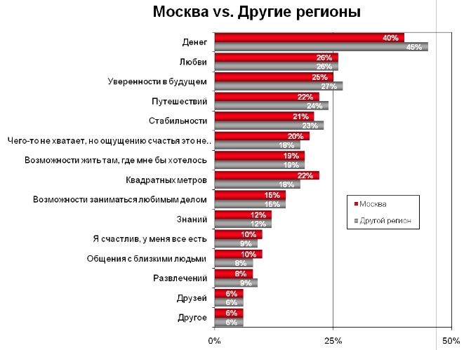 Судя по результатам опроса, мужчинам в большей степени, нежели женщинам, не хватает денег (47% против 40%) и связанной с ними стабильности (27% против 25%). А женщины в большей степени нуждаются в любви (29% против 24%). Женщины чаще испытывают потребность в путешествиях, чем мужчины (27% против 20%). Женщины чаще упоминали пресловутую нехватку квадратных метров (20% против 17%), а мужчинам чаще мешает нехватка знаний (14% против 11%).
