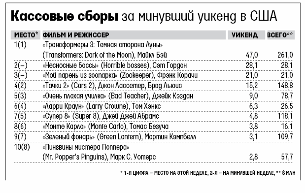 На второй строчке «Несносные боссы» с $28,1 млн. Абсолютные показатели не впечатляют – «Очень плохая училка», которая теперь скромно ютится на пятом месте, три недели назад собрала в премьерные выходные $32 млн. Однако относительный результат выглядит неплохо на фоне другого релиза этой недели под названием «Мой парень из зоопарка», которому достался только $21 млн, при том что фильм шел большим количеством копий и производство его обошлось в два раза дороже, чем бюджет «Несносных боссов». Режиссер фильма долго тренировался шутить и классифицировать управленцев на площадке сериала «Офис». Руководящие кадры в исполнении Кевина Спейси, Колина Фаррела и Дженнифер Энистон развеселили уставшую на работе аудиторию старше двадцати пяти с легким преобладанием мужчин (около 51%).