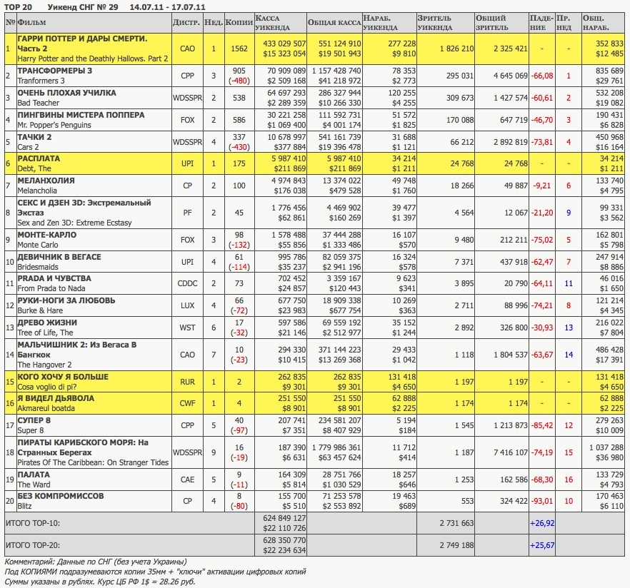 Впрочем, премьера нового "Гарри Поттера" позволила повысить выручку отечественного проката за неделю сразу на 25,6%. Кроме этой ленты в пятерке лидеров рейтинга проката не оказалось ни одной премьеры. На второе место с первого спустились "Трансформеры-3" с результатом выходных в 71 млн руб. ($2,5 млн). На третьем обосновалась "Очень плохая училка", заработавшая за выходные 64,7 млн руб ($2,3 млн). Четвертое оккупировали "Пингвины мистера Поппера" с выручкой в 30 млн руб ($1 млн). А на пятом припарковались "Тачки-2" с кассой в 10,7 млн руб. ($377 884).